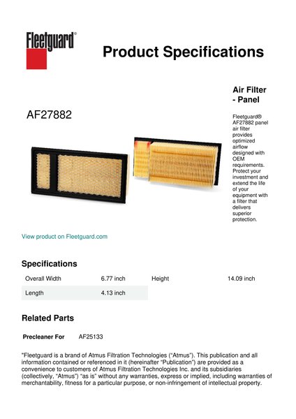 Fleetguard® AF27882 panel air filter provides optimized airflow designed with OEM requirements. Protect your investment and extend the life of your equipment with a filter that delivers superior protection.Specification
