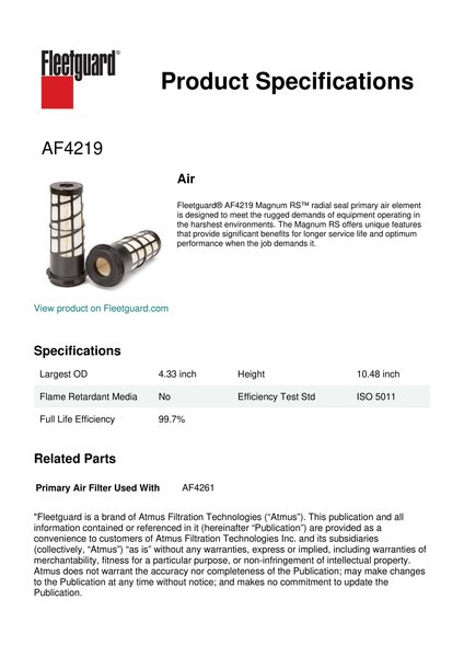 Fleetguard® AF4219 Magnum RS™ radial seal primary air element is designed to meet the rugged demands of equipment operating in the harshest environments. The Magnum RS offers unique features that provide significant benefits for longer service life and optimum performance when the job demands it.Specification