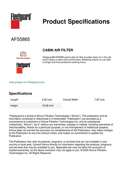 Fleetguard® AF55865 panel cabin air filter provides clean air in the cab which means a clean work environment. Breathing cleaner air can lead to longer and more productive working hours.Specification