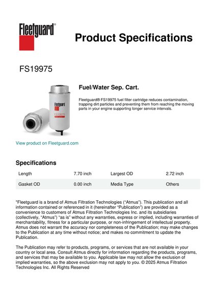 Fleetguard® FS19975 fuel filter cartridge reduces contamination, trapping dirt particles and preventing them from reaching the moving parts in your engine supporting longer service intervals.Specification