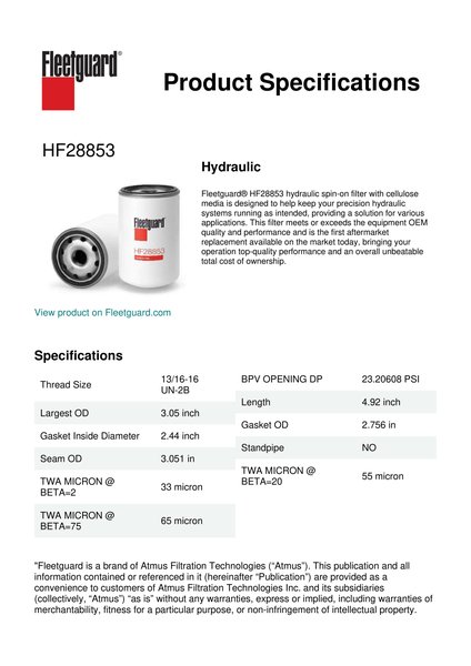 Fleetguard® HF28853 hydraulic spin-on filter with cellulose media is designed to help keep your precision hydraulic systems running as intended, providing a solution for various applications. This filter meets or exceeds the equipment OEM quality and performance and is the first aftermarket replacement available on the market today, bringing your operation top-quality performance and an overall unbeatable total cost of ownership.Specification