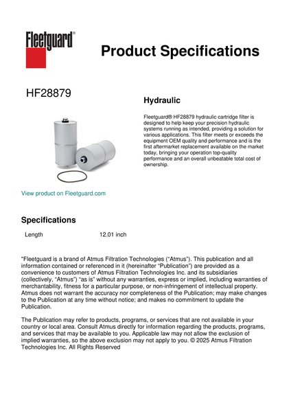 Fleetguard® HF28879 hydraulic cartridge filter is designed to help keep your precision hydraulic systems running as intended, providing a solution for various applications. This filter meets or exceeds the equipment OEM quality and performance and is the first aftermarket replacement available on the market today, bringing your operation top-quality performance and an overall unbeatable total cost of ownership.Specification