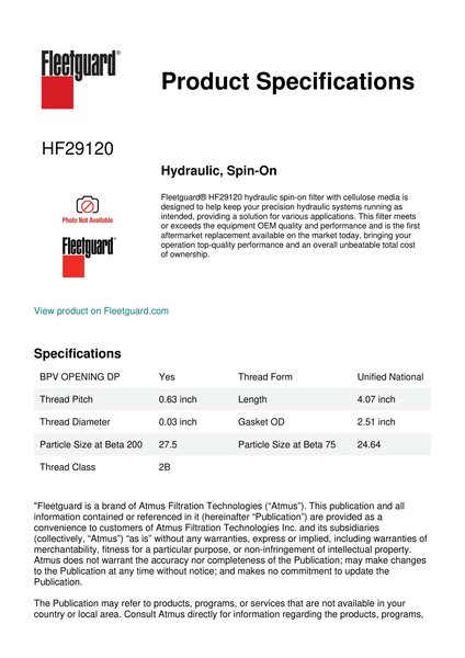 Fleetguard® HF29120 hydraulic spin-on filter with cellulose media is designed to help keep your precision hydraulic systems running as intended, providing a solution for various applications. This filter meets or exceeds the equipment OEM quality and performance and is the first aftermarket replacement available on the market today, bringing your operation top-quality performance and an overall unbeatable total cost of ownership.Specification