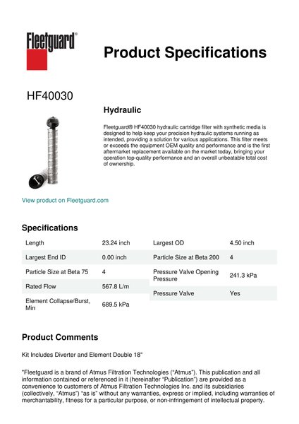 Fleetguard® HF40030 hydraulic cartridge filter with synthetic media is designed to help keep your precision hydraulic systems running as intended, providing a solution for various applications. This filter meets or exceeds the equipment OEM quality and performance and is the first aftermarket replacement available on the market today, bringing your operation top-quality performance and an overall unbeatable total cost of ownership.Specification